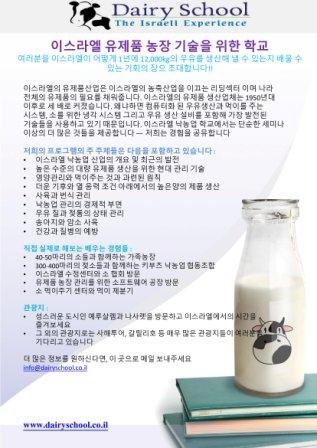 이스라엘의 유제품산업은 이스라엘의 농축산업을 이끄는 리딩섹터 이며 나라 전체의 유제품의 필요를 채워줍니다. 이스라엘의 유제품 생산업체는 1950년대 이후로 세 배로 커졌습니다. 왜냐하면 컴퓨터화 된 우유생산과 먹이를 주는 시스템, 소를 위한 냉각 시스템 그리고 우유 생산 설비를 포함해 가장 발전된 기술들을 사용하고 있기 때문입니다. 이스라엘 낙농업 학교에서는 단순한 세미나 이상의 더 많은 것들을 제공합니다 ㅡ 저희는 경험을 공유합니다